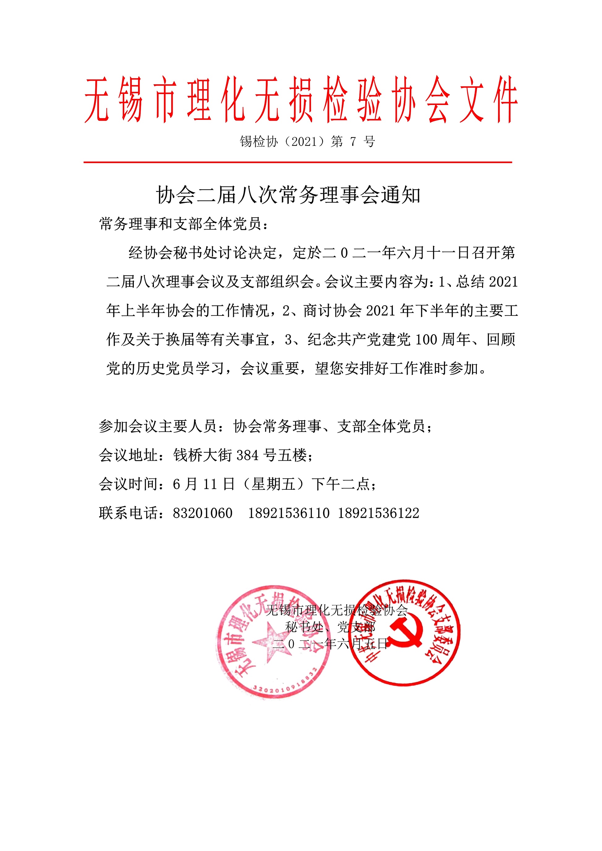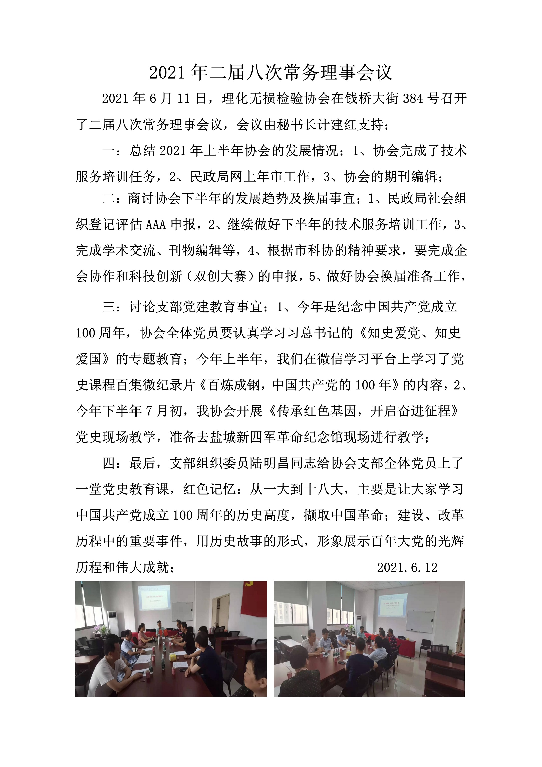 经协会秘书处讨论决定,定於二0二一年六月十一日召开第二届八次理事会议及支部组织会。会议主要内容为:1、总结2021年上半年协会的工作情况,2、商讨协会2021年下半年的主要工作及关于换届等有关事宜,3、庆祝共产党建党100周年、回顾党的历史党员学习,会议重要,望您安排好工作准时参加。