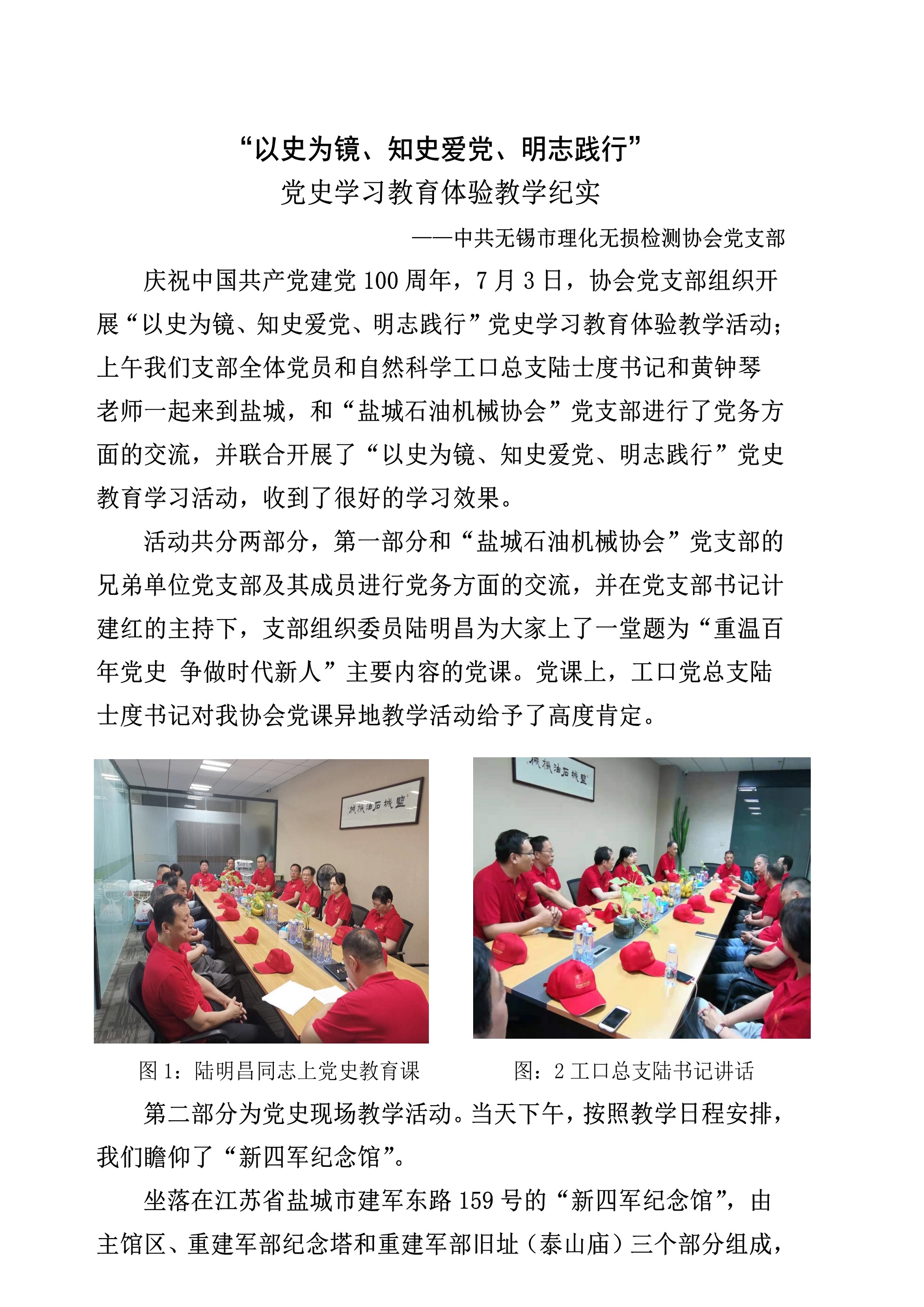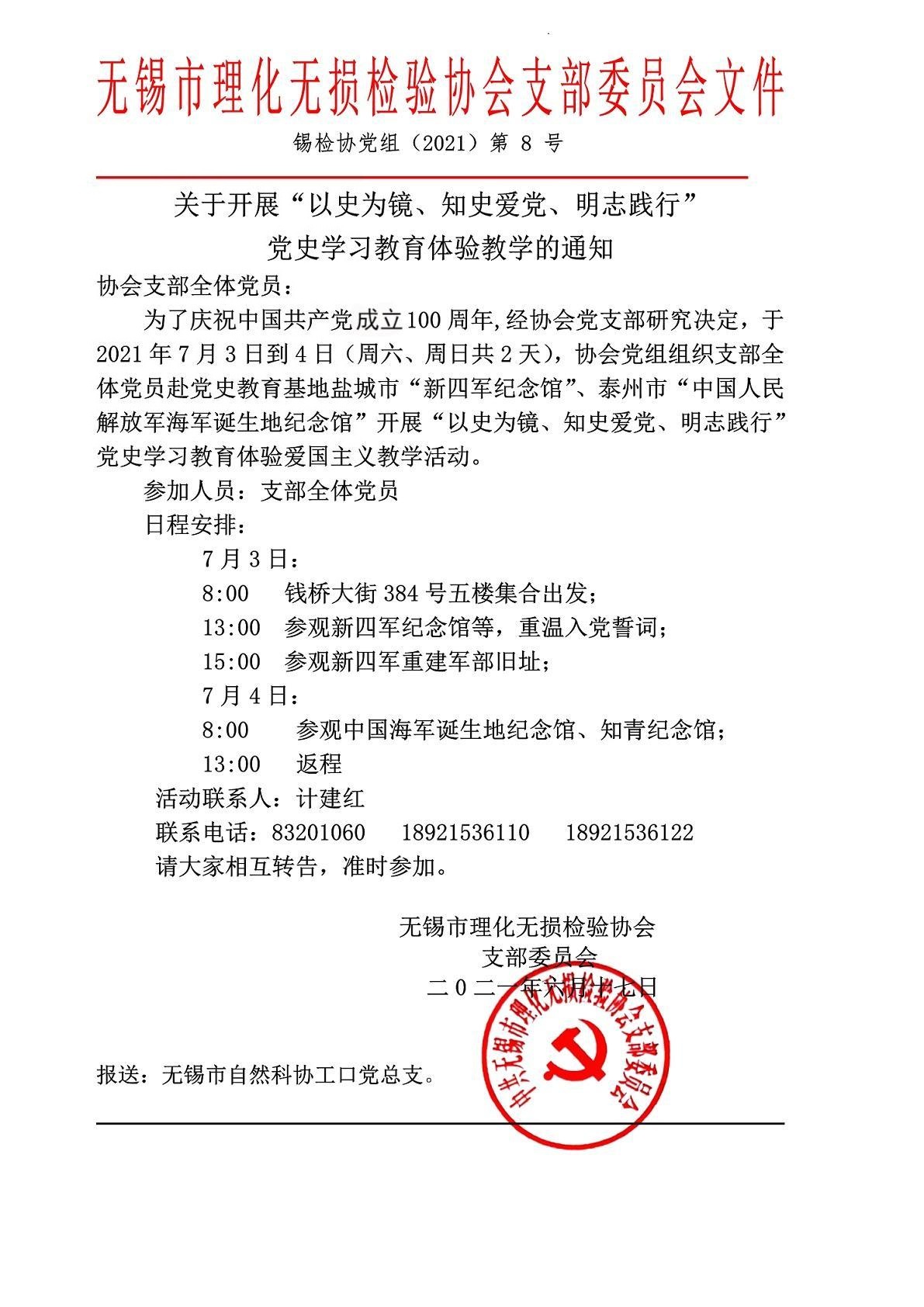 为了庆祝中国共产党成立100周年,经协会党支部研究决定,于2021年7月3日到4日(周六、周日共2天),协会党组组织支部全体党员赴党史教育基地盐城市“新四军纪念馆”、泰州市“中国人民解放军海军诞生地纪念馆”开展“以史为镜、知史爱党、明志践行”党史学习教育体验爱国主义教学活动。